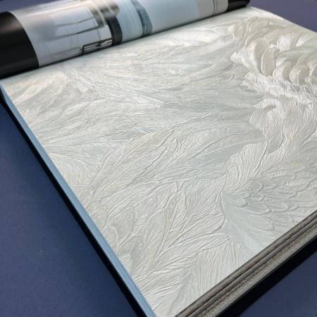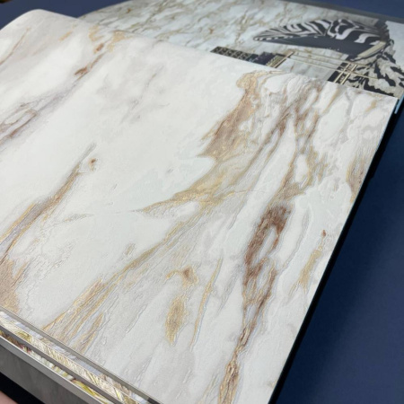 Второй сет - это оригинальные изгибы дамаска, скомбинированные с полотнами, имитирующими шкуры животных, и небрежной эстетикой имитации штукатурки. Однотонные полотна с объемными кракелюрами позволят разнообразить дизайн и визуально сегментировать пространство.
